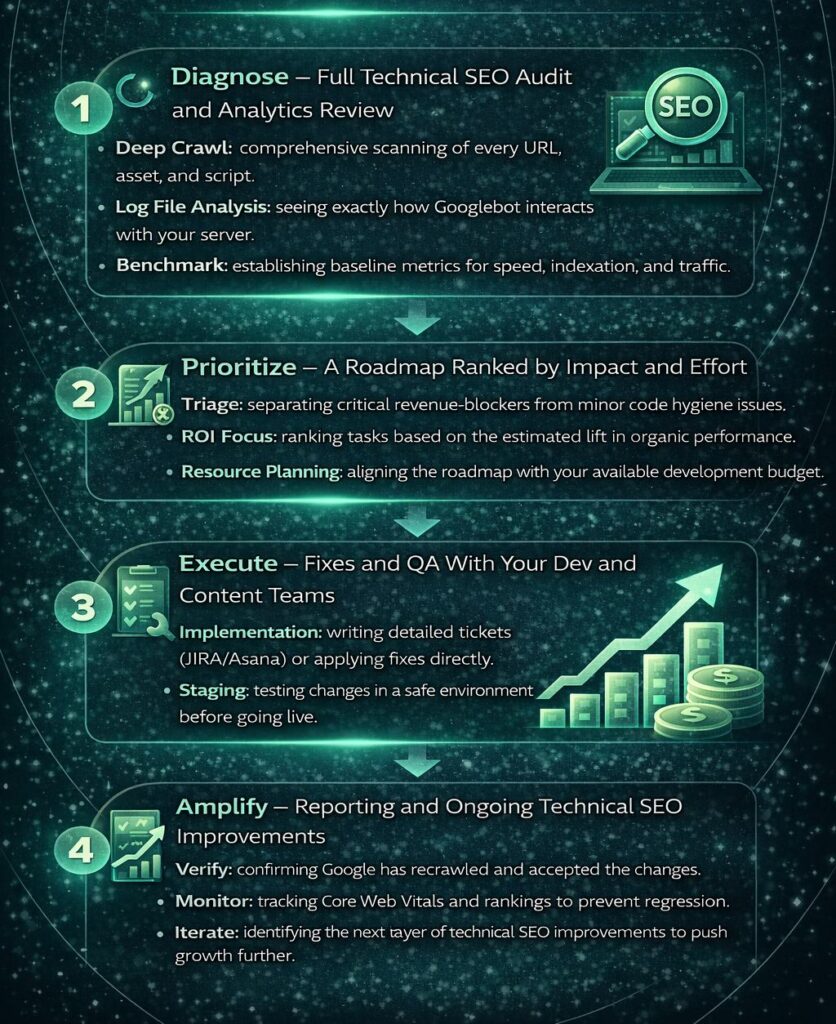 Stop gambling with your revenue. Our technical SEO services stabilize your infrastructure, turning organic search into a predictable channel as reliable as paid ads.